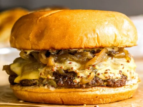 4. Monte o hambúrguer. Coloque a cebola caramelizada por cima do queijo ainda quente para que os sabores se misturem melhor.